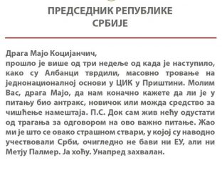 Председник Александар Вучић поново је упитао портпаролку високе представнице ЕУ за спољну политику и безбедност Мају Коцијанчич да ли може да каже којим отровом су отровани чланови ЦИК-а у Приштини. [mkd_dropcaps type="square" color="" background_color=""]А[/mkd_dropcaps]лександар Вучић је