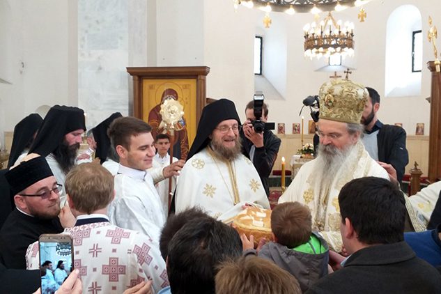 „Видимо како данас овај храм сија у свој својој лепоти. А има их који памте, није то тако давно било, када је читав кров пао, рушевине су биле, остали су само зидови, поцрнели и нагарављени. Многи су се питали хоће ли живот икада овде поново бујати. Ево, из године у годину, све је свечаније, све је радосније. Све нас је више, свештенства, монаштва, богословаца са својим професорима. Сви ви који сте дошли са разних страна, прослављамо празник који је истовремено и слава нашега епископа, па је још већи и радоснији. Као и овај храм, као Свети великомученик Георгије, и наш владика овде годинама сведочи веру у распетог и васкрслог Господа Исуса Христа“, рекао је игуман Сава.