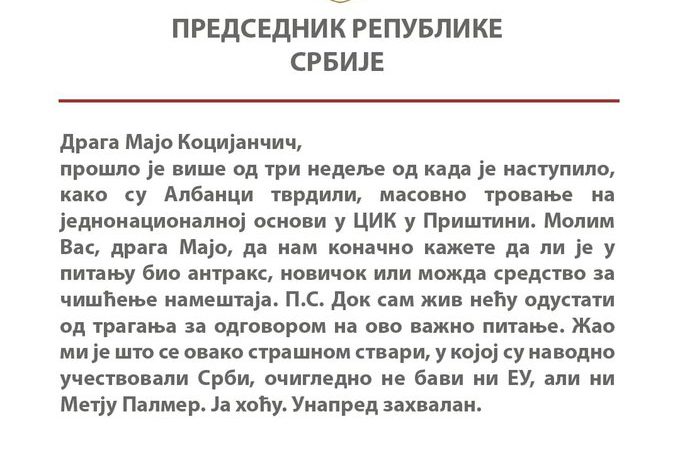 „Драга Мајо Коцијанчич, прошло је више од три недеље од када је наступило, како су Албанци тврдили, масовно тровање на једнонационалној основи у ЦИК-у у Приштини. Молим вас, драга Мајо, да нам коначно кажете да ли је у питању био антракс, новичок или средство за чишћење намештаја. П. С. Док сам жив нећу одустати од трагања за одговором на ово важно питање. Жао ми је што се овако важном ствари у којој су наводно учествовали Срби очигледно не бави ни ЕУ, али ни Метју Палмер. Ја хоћу. Унапред захвалан“, написао је Вучић.